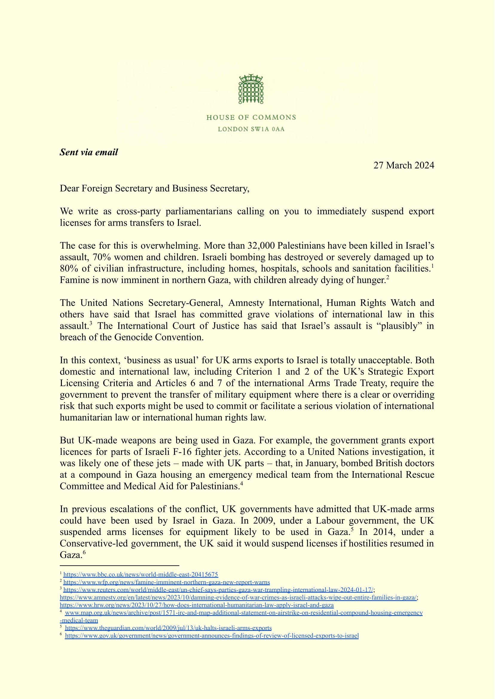 HomeNewsCross Party letter calling for arms to Israel to be suspended