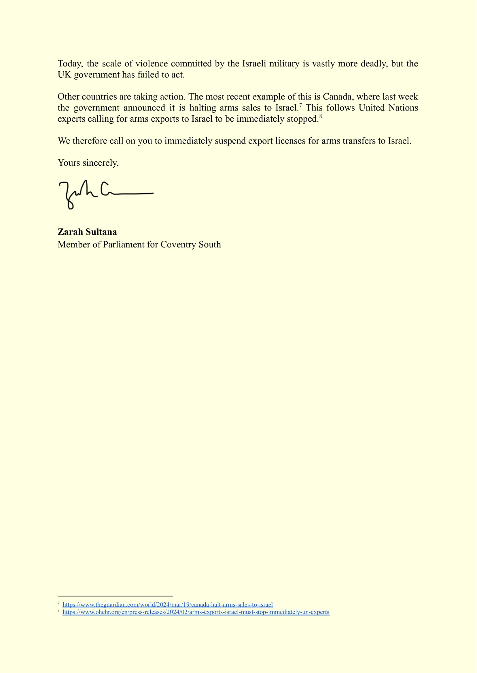 I have signed the cross-party letter calling on the government to immediately suspend arms sales to Israel. The letter was signed by 135 parliamentarians, from parties across the political spectrum.