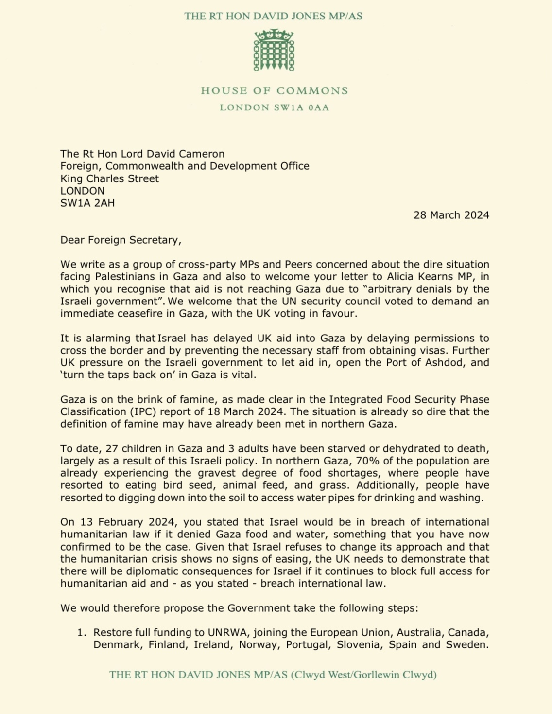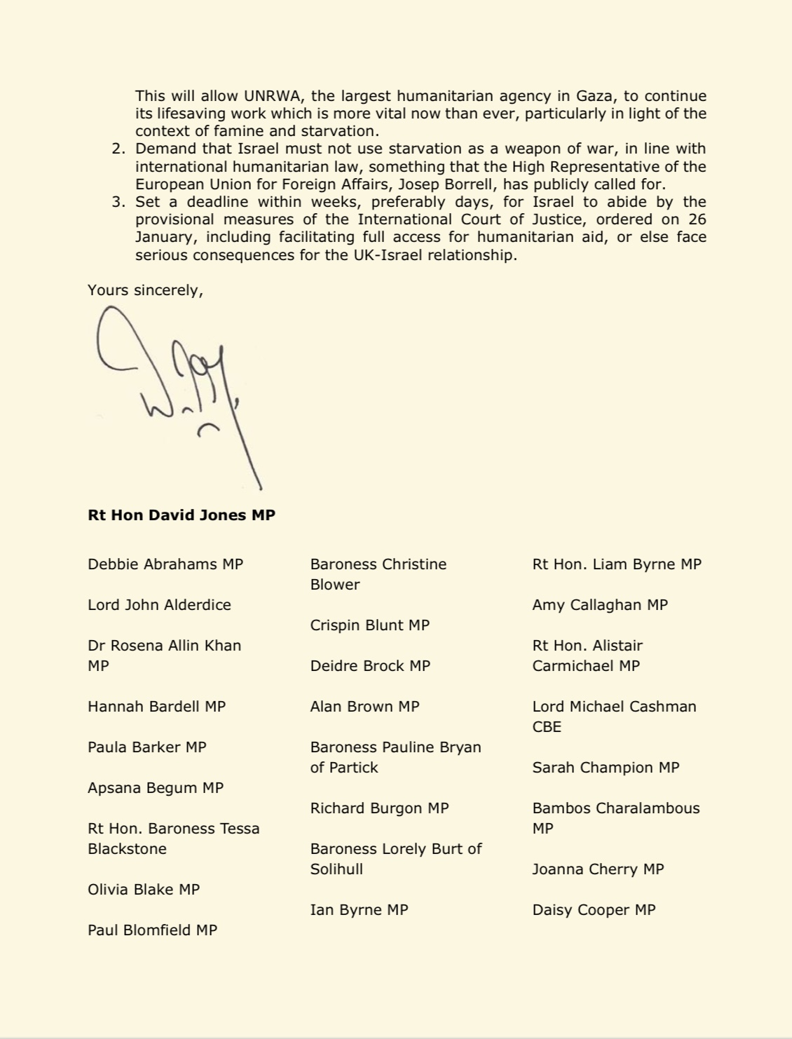 I have added my name to this letter of cross-party Parliamentarians on famine in Gaza, demanding that Israel stops using starvation as a weapon of war, demanding the restoration of UK funds to UNRWA and on the UK government to put pressure on Israel as it continues to block full access of humanitarian aid into Gaza, in breach of international law . The letter has been sent to the Foreign Secretary, Lord Cameron.