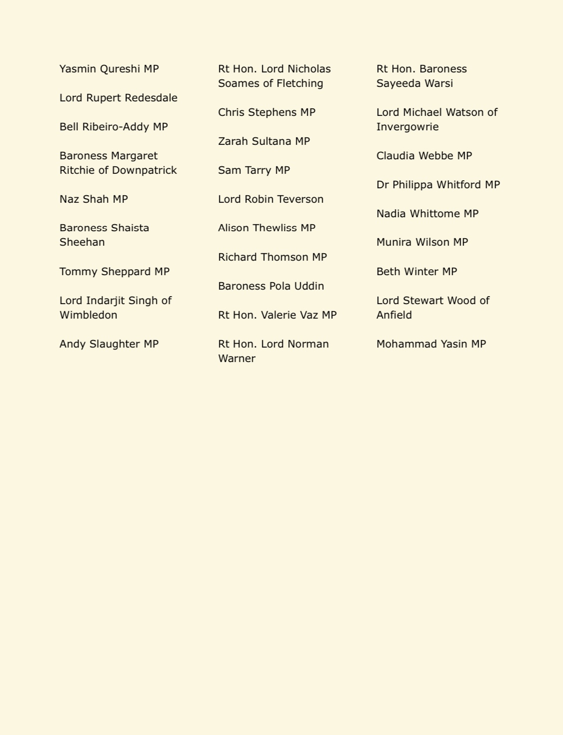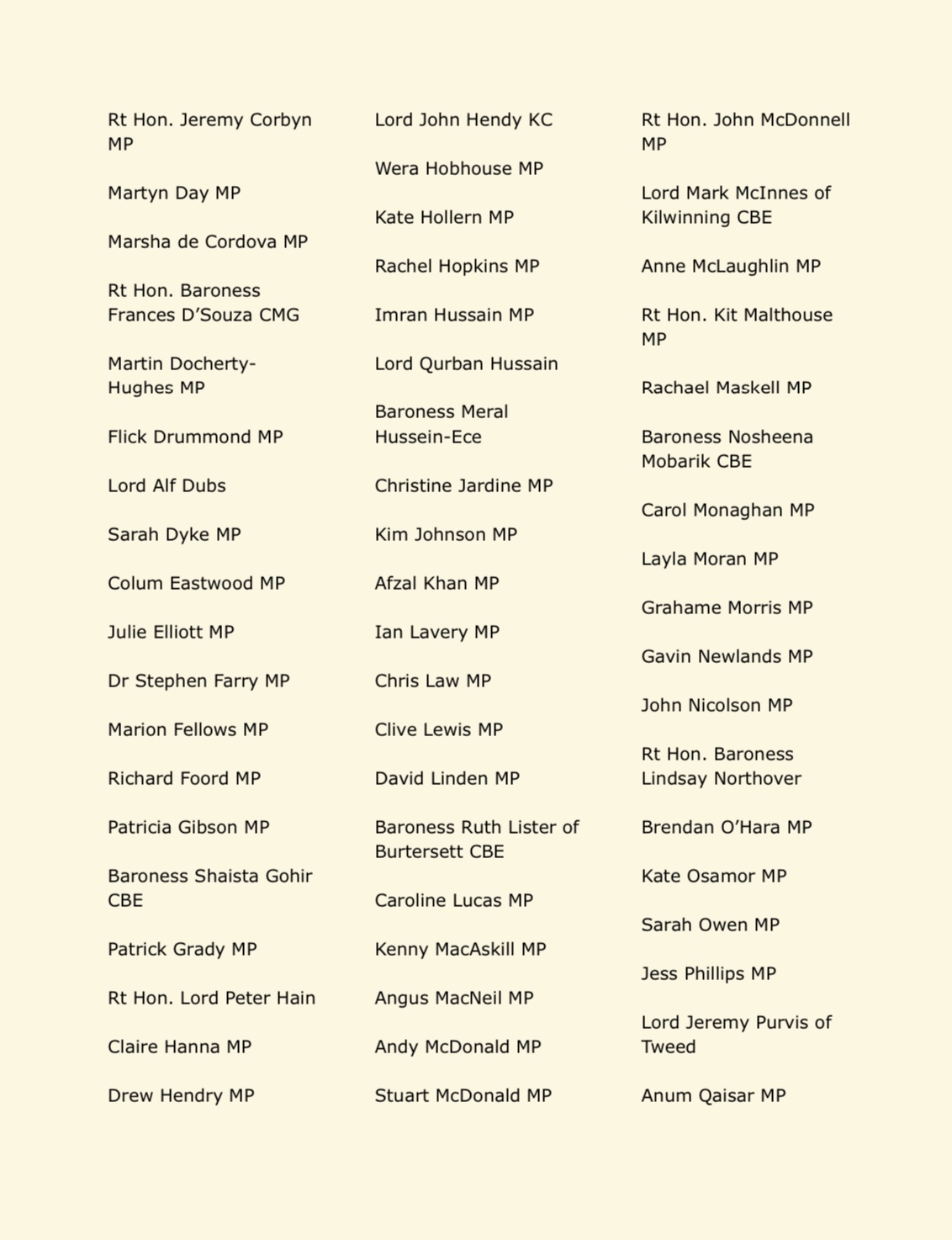Parliamentarians who add their names once the letter had been sent are as follows: